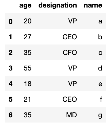 'designation': ["VP", "CEO", "CFO", "VP", "VP", "CEO", "Dr."]} And we know that we tin can create a Pandas DataFrame out of a python dictionary past invoking DataFrame(...) function